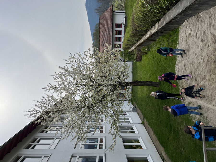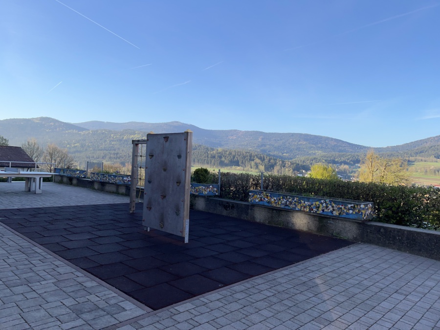 Seit aber das Kriegerdenkmal an einen anderen Ort verlegt wurde, übt eine Kletterwand an dieser Stelle eine riesige Anziehungskraft aus. Die Kinder schauen sich in der Pause die Welt von oben an.